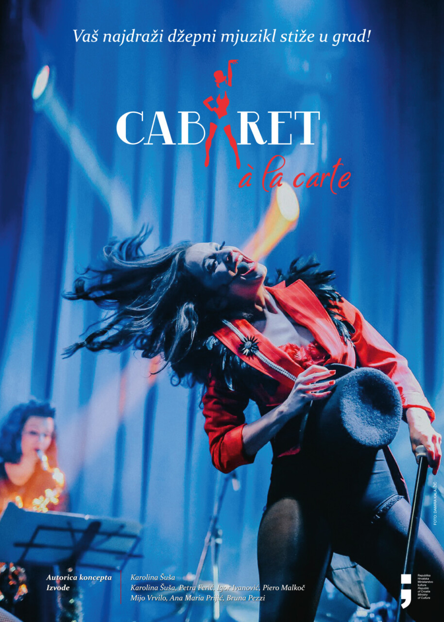 Cabaret à la carte je ‘džepni mjuzikl’, pravi kabaretski show s glazbom uživo. Kostimiran u stilu Great Gatsbyja, donosi hitove starog Broadwayja koje znate uz točke koje ćete zavoljeti, autorsku poeziju i koreografije, kao i mnogo spontane direktne interakcije s publikom, kako jednom cabaretu i priliči. Bit će tu svjetskih hitova iz Chicaga, Cabareta i drugih velikih mjuzikala, ali i hrvatskih hitova iz 60-ih.