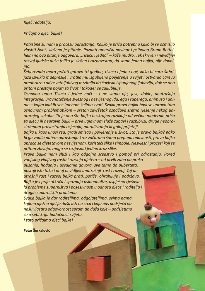 Riječ redatelja: “Pričajmo djeci bajke! Prava bajka nam služi kao odgojno sredstvo i pomoć pri odrastanju. Osim vanjskoga vidljivog rasta i razvoja djeteta – od prvih zuba pa preko puzanja, hodanja i usvajanja govora, sve do puberteta, postoji isto tako i onaj nevidljivi unutarnji rast i razvoj. Taj unutarnji rast i razvoj bajka prati, potiče, ohrabruje i podržava. Bajka je i prije otkrića i spoznaja psihoanalize uspješno rješavala probleme suparništva i posesivnosti u odnosu djece i roditelja i drugih suparničkih problema. Svaka bajka je dar roditeljima, odgajateljima, svima nama kojima nježna dječja duša leži na srcu i koja nas podsjeća na našu vlastitu odgovornost spram tih duša koje – podsjetimo se u sebi kriju budućnost svijeta. I zato pričajmo djeci bajke!”